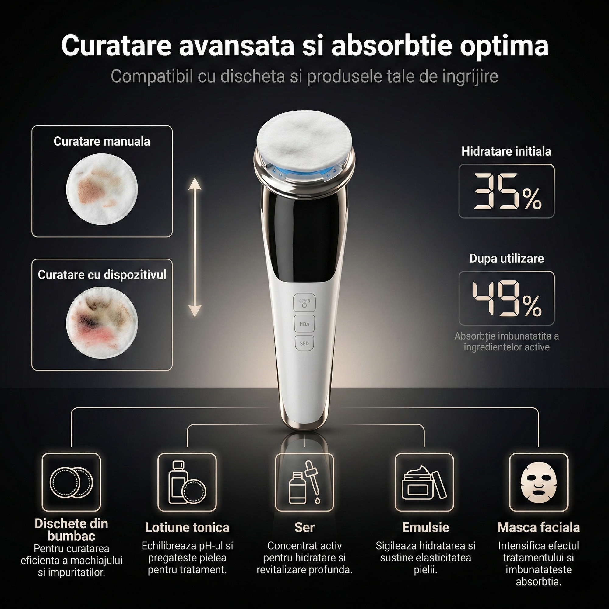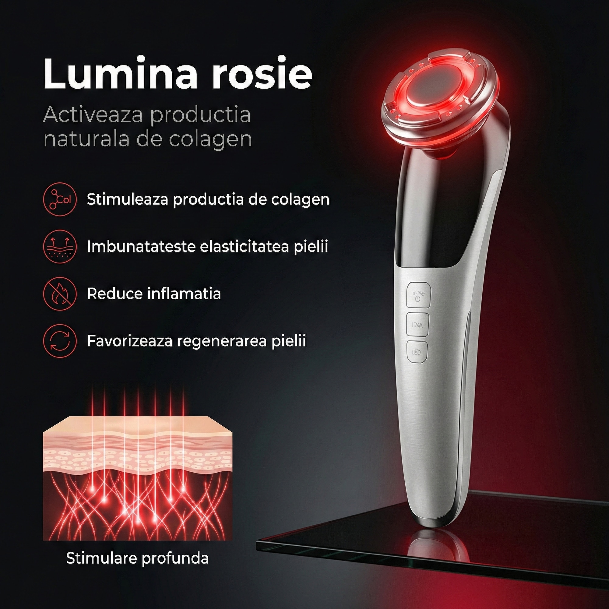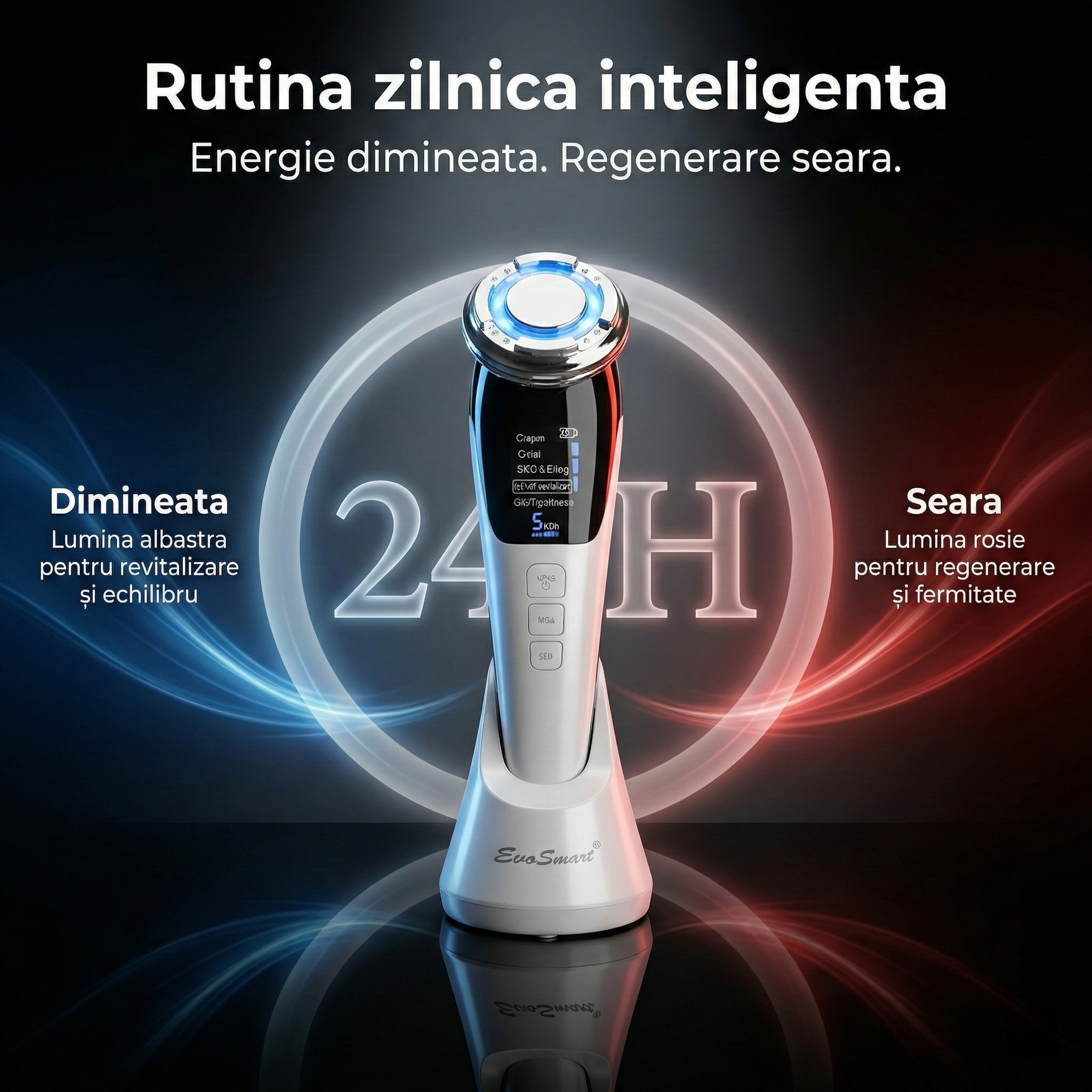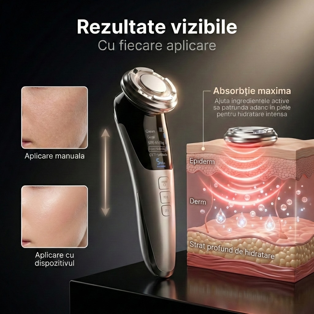 Prin tehnologia sa inovatoare, aparatul utilizează vibrații de înaltă frecvență pentru a stimula circulația sângelui și a promova regenerarea celulară, asigurându-se că pielea sa rămâne tânără și radiantă. Funcțiile de încălzire și răcire sunt menite să optimizeze efectele produselor cosmetice, iar lumina roșie și albastră se adaptează perfect nevoilor fiecărui tip de ten, ajutând la reducerea ridurilor și a imperfecțiunilor.